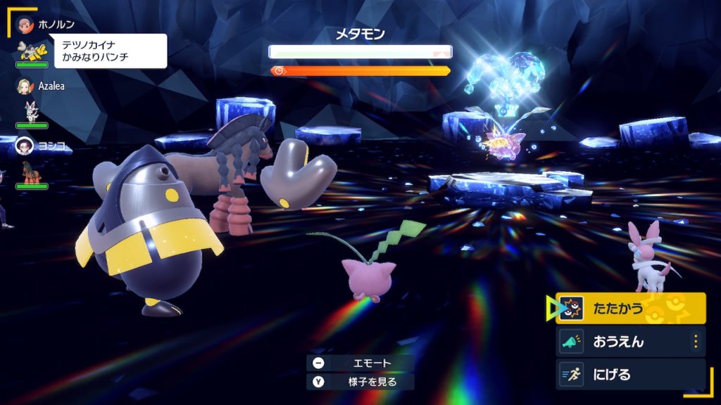 とくせいの「かわりもの」と使えるわざの「へんしん」によって、パーティーの先頭(今回のレイドバトルの場合はプレイヤーが繰り出したポケモン)になります。
