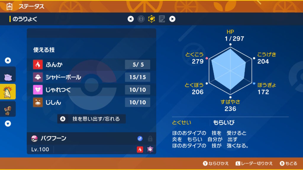 捕まえたバクフーンの能力と技