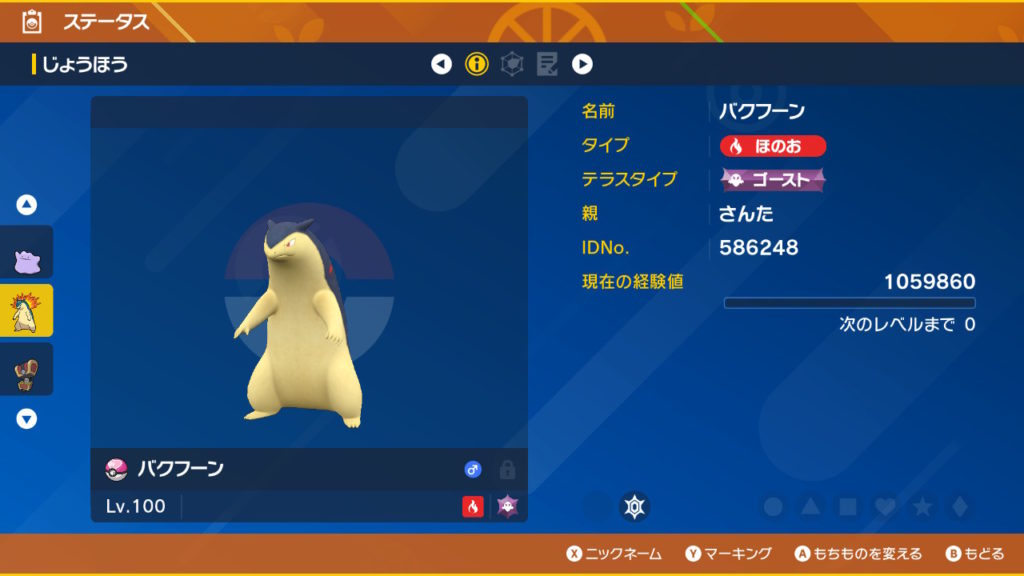こうすることで、ふんどのこぶしの火力が増すのと、バクフーンが使ってくるじゃれつくとじしんがほぼほぼ効かなくなる。